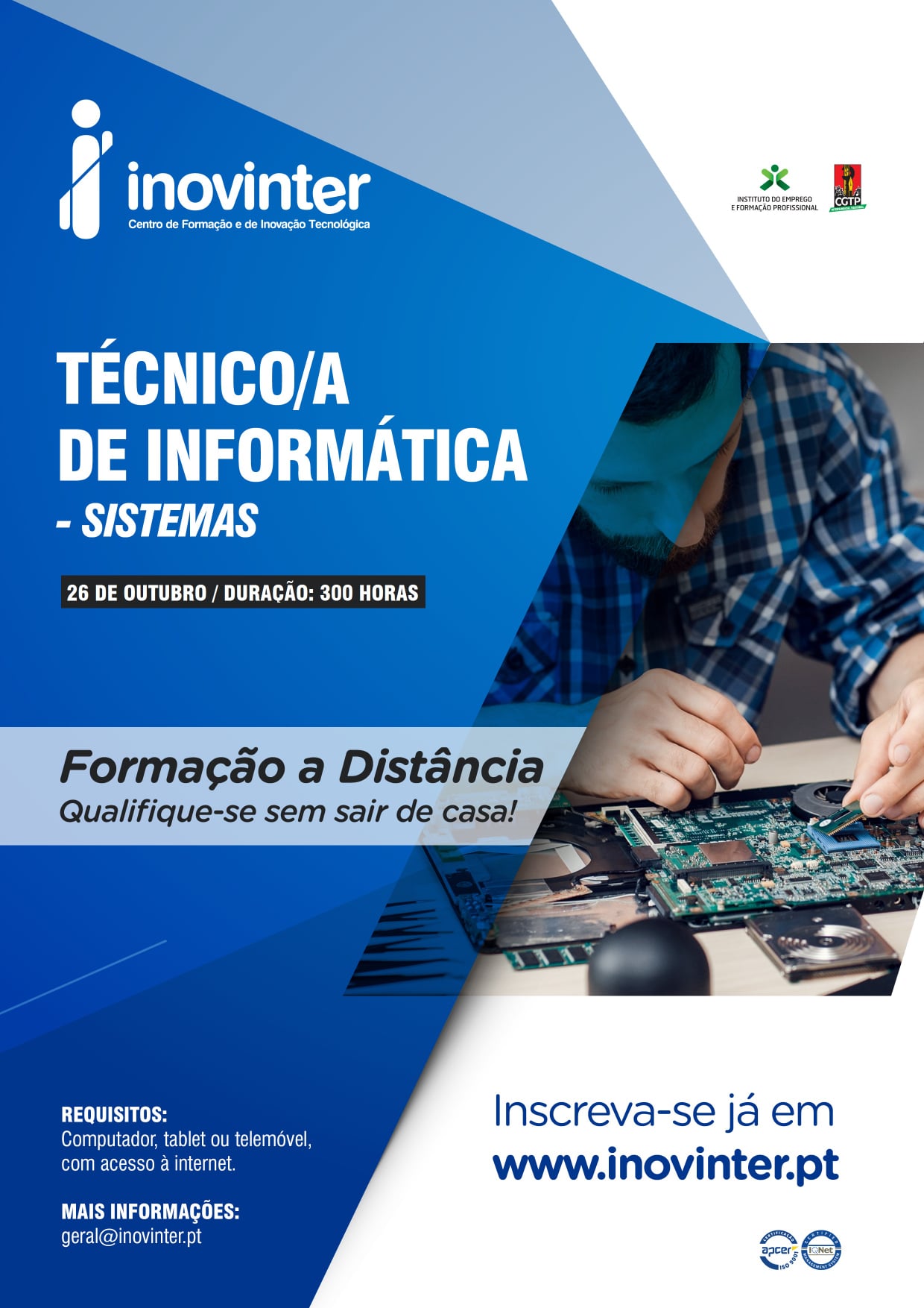 – Curso de técnico/a de informática (sistemas) | 300 horas | Horário laboral – 2ª a 5ª (9h-13h e 14h-17h)